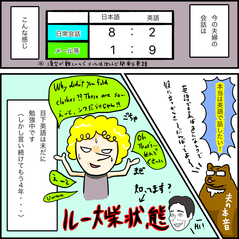 夫と話す時は、出来るだけ英語で話そう!という努力をしているつもりなのですが、難しい話や急ぎの時などは日本語で済ませてしまい、結局夫の日本語レベルが日に日に上がっています('A`|||)