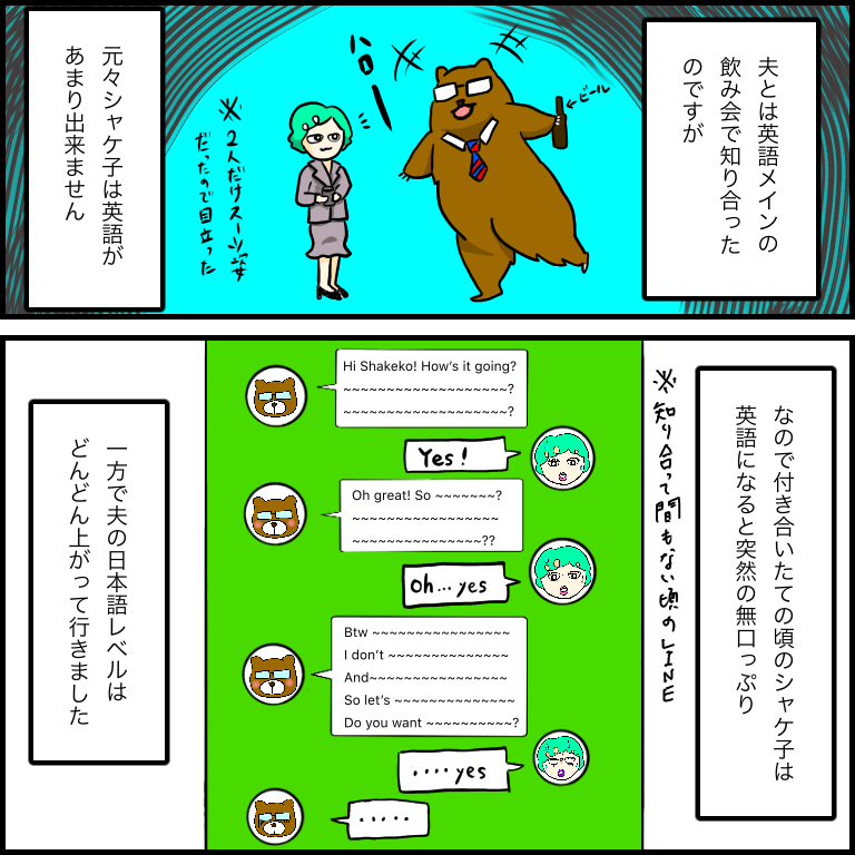 だいたいの国際結婚カップルの皆さんは、英語が堪能でいらっしゃるのでお恥ずかしい話なのですが、シャケ子の英語力は、簡単な日常会話レベルです。