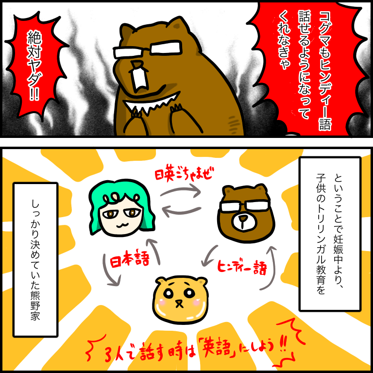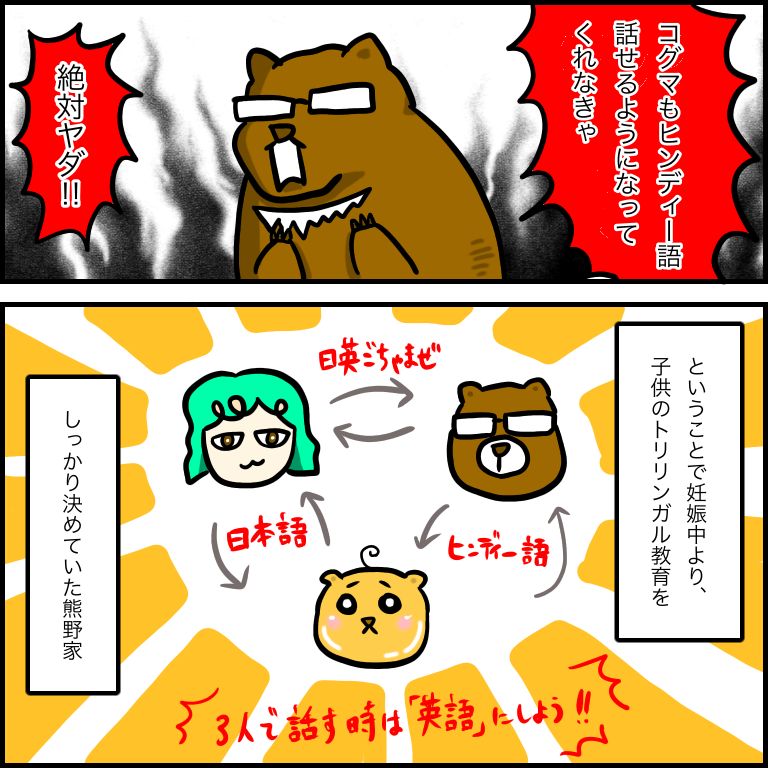 なのでコグマにはヒンディー語を話せるようになって欲しい!という気持ちが夫も強く、また当然英語は必要だとも思うので、日本語&ヒンディー語&英語の3ヶ国語を話せるように、我が家では計画していました。