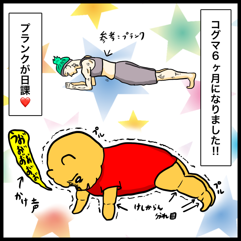 赤子のプランクまじで可愛い 2019年08月26日 コグマ、生後6ヶ月になりました!息子、暇さえあればプランクしてる。ちなみに、ずり這いも、ハイハイもまだしない。朝起きて、おはようプランクパイ飲んで、ごちそうさまプランク眠い時は、悶絶プランク昼寝から起きて、ごきげんようプランクミルク飲んで、ゲフー(ゲップ)プランク寝る時に、おやすみプランク。振り向くと、プランクプランク3分プランク [Prime Video]トランダイブログランキングに参加しています 良かったらクリック(投票)お願いします※画面が切り替わったら投票完了です※ 「コグマ0歳6ヶ月」カテゴリの最新記事 タグ :#絵日記#コミックエッセイ#インド熊家族#育児漫画#生後6ヶ月#プランク#上腕二頭筋#ハムストリング#肉の割れ目たまらん < 前の記事次の記事 > コメント コメントフォーム 名前 コメント 記事の評価 リセット リセット 顔 星 情報を記憶 コメントを投稿する