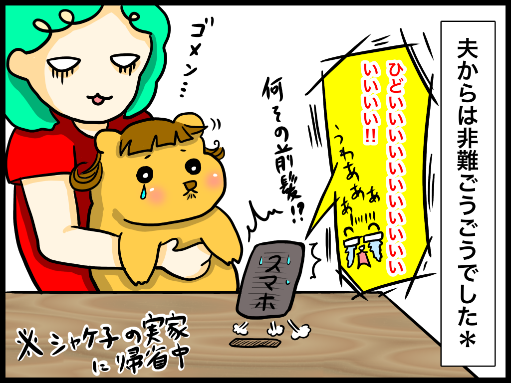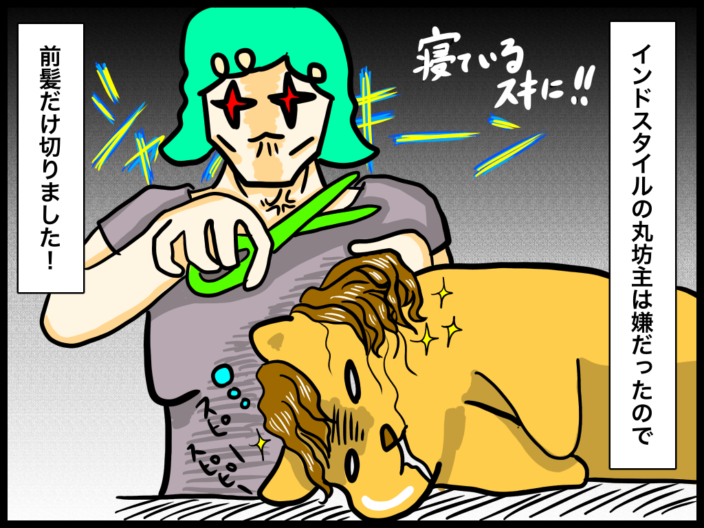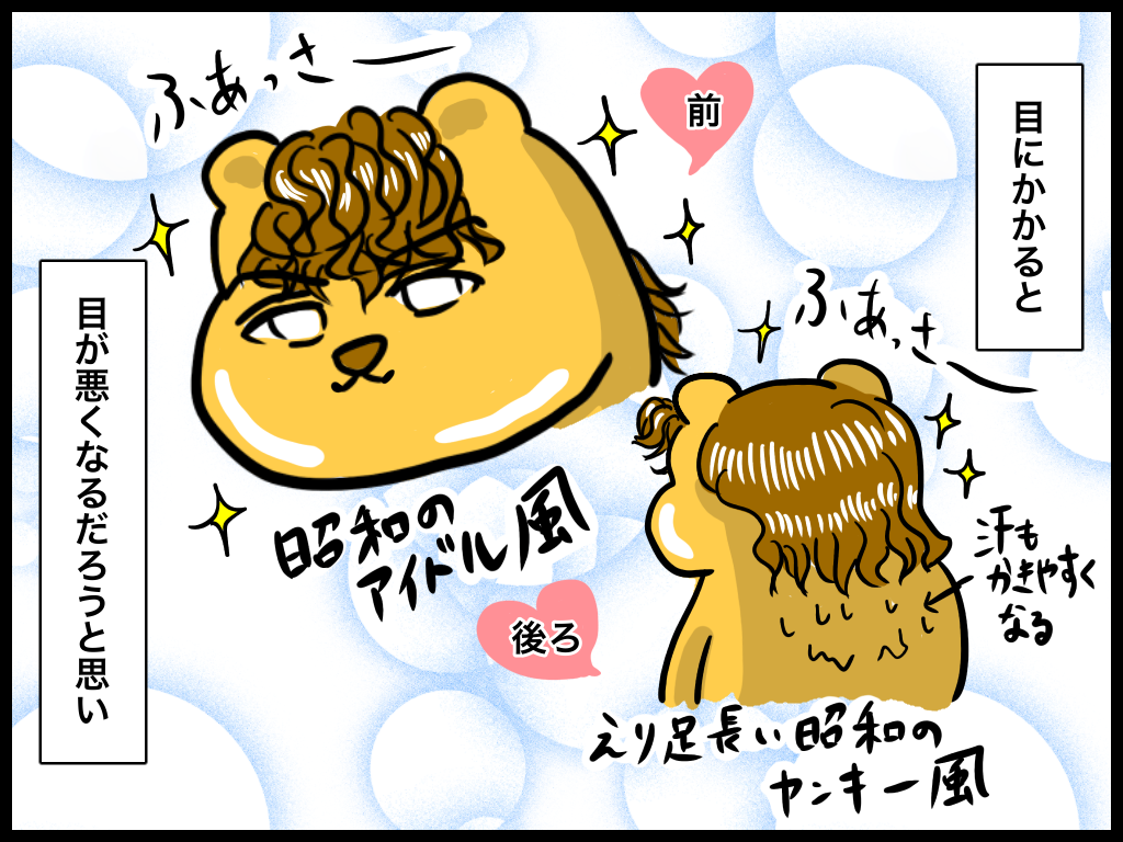 コグマが動くから、「早く切らなきゃ!」とか「何回も切るの大変だから短めにしておこう!」という気持ちが焦りと共に重なって、こうなりました。