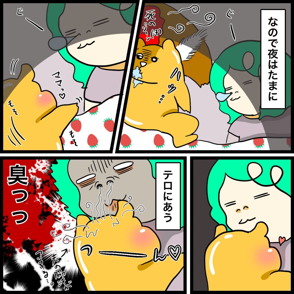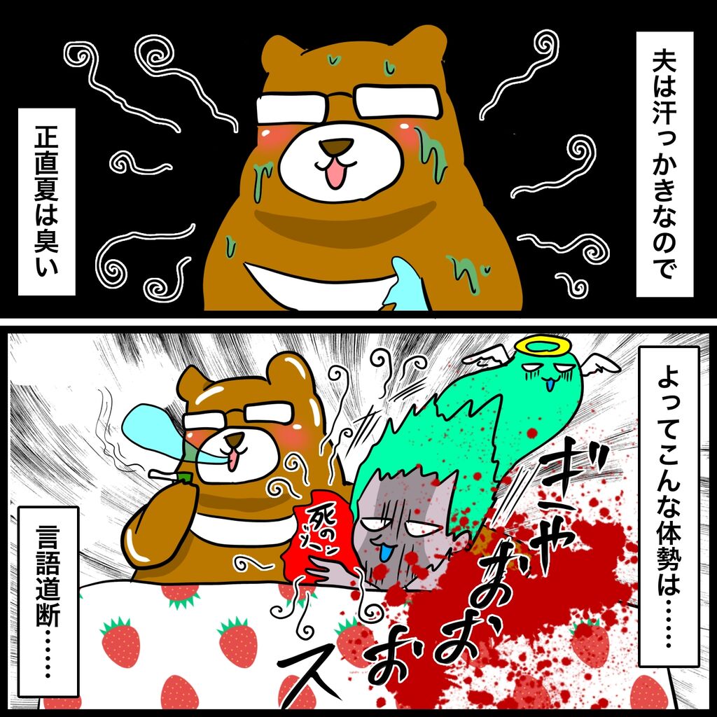 深夜のテロリスト 2020年08月30日 腕枕とか、元々好きではないのですが、相手が夫の場合(場合って何だ)、まず絶対したくねえええ。悪いけど、死のゾーン(脇汗)やべえええええ……………そこはまるで……DEATH ジャングル…………!可愛い息子を使っての(?)テロ行為………!許せない!ダメ、絶対!さて今週末は3月ぶりにパソコンを開けず、全く仕事をしなかったのですごくリフレッシュしました。今週はシーズン1から大好きだった、「 アグレッシブ烈子」のシーズン3が先週公開されたので夫婦で観ました。 烈子のデスボイス聴きながらビール飲むの。ああ、幸せ〜おしまい。▼過去記事リンク 「育児」カテゴリの最新記事 タグ :#テロリスト#漫画が読めるハッシュタグ < 前の記事次の記事 > コメント コメント一覧 (4) 1. 眉毛 2020年08月31日 23:25 面白くて楽しくて一日で最初から最新まで読み切ってしまいました!ありがとうございます🙏 私もバングラデシュの方とお付き合いしたことがあるんですが、ワキガ用の制汗剤つけて!と無理やりつけさせていました笑 本人はあまり心地よさそうではありませんでしたが😅 インドあたりの方々は皆さん匂いのケアなどはしないのでしょうか? そもそもワキガを臭いと認識しないとか? ずっと疑問に思っていたので 質問してしまいました。 これからも更新楽しみにしています♡ 0 kumanoshakeko がしました 2. シャケ子 2020年08月31日 23:37 >>1 眉毛さん まぁ、全部読んでくださったとは....ありがとうございますー!!!!インドはパウダーの制汗剤がありますね、結構みんなバシバシ使います。でも汗とスパイスと制汗剤が入り混じって、私的にはなんとも言えない気分になります....(残念すぎふ😂) 0 kumanoshakeko がしました 3. さぁや 2020年09月02日 08:52 これ、本当にわかります 笑 私の彼氏は、インドのハリヤナ州出身で、今は日本で、友達数人と暮らしているので、私が会いに行く形になるのですが、もう、玄関入ったとたん、マサラー♪ワキガー♪足の匂いー♪が強烈です 笑 そして、デオドラントの匂いも強烈です 笑 寝る時、私もシャケこさんのようにワキガテロにあいます( ꈨຶ ˙̫̮ ꈨຶ ) 0 kumanoshakeko がしました 4. シャケ子 2020年09月02日 22:32 >>3 さぁやさん コメントありがとうございますー! それは....お察しします!男友達数人だともう.....かかってこーい!なスメルでしょうね.....(*´Д`*) 夏の夜は特に近寄りたくないですよねw 0 kumanoshakeko がしました コメントフォーム 名前 コメント 記事の評価 リセット リセット 顔 星 情報を記憶 コメントを投稿する